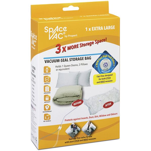 Save on space with the Space Vac Vacuum-Seal Storage Bag. This extra large bag has a cap-free design and works with both stick and hose vacuum cleaners. Store one queen doona, 2 pillows (or equivalent) and protect your clothes or manchester against dust, insects, dirt, mildew and odours.